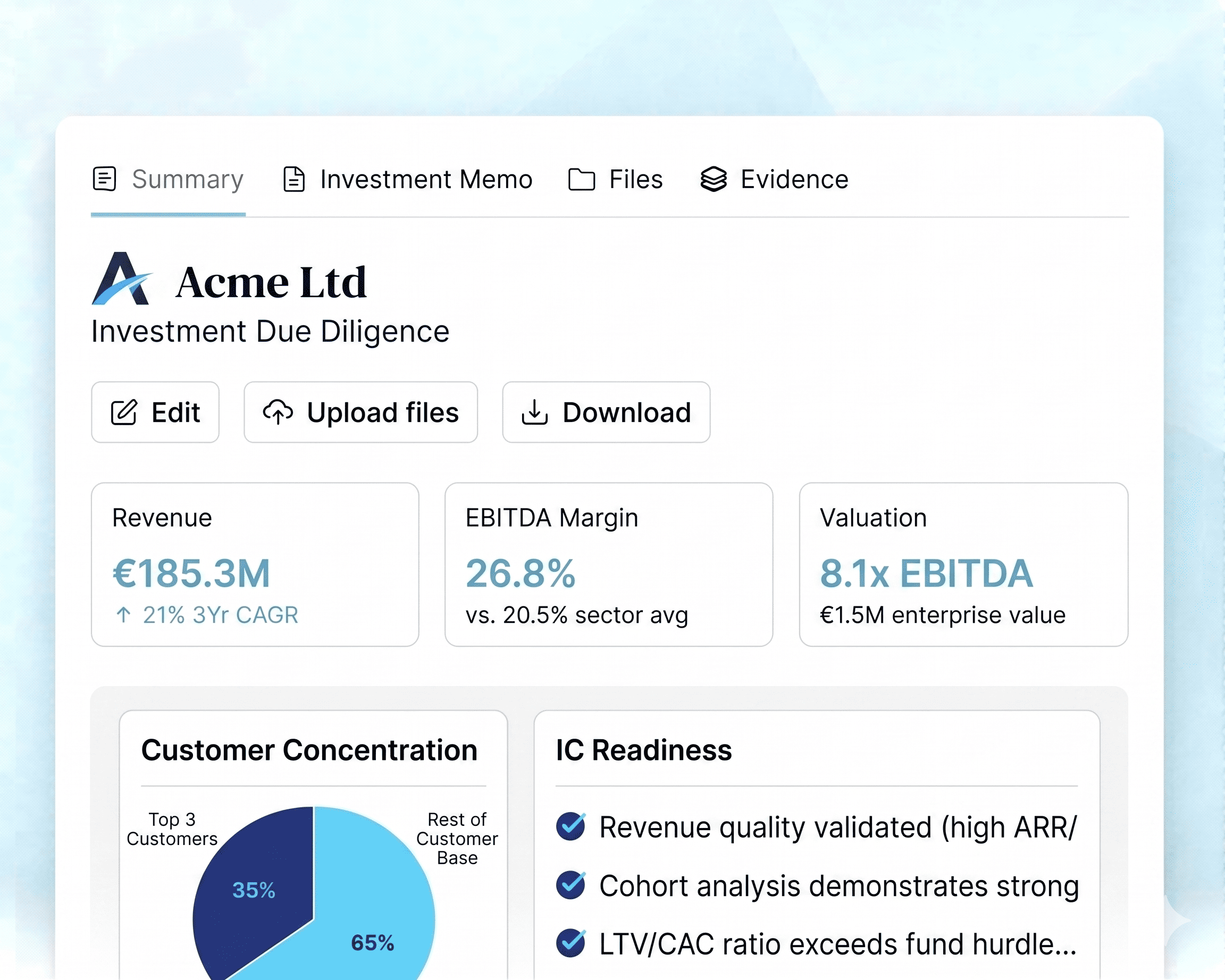 European private capital teams, including PE buyout funds, VC and growth equity investors, corporate ventures, and family offices involved with direct investments. The platform is designed for firms where document-heavy deal volume per analyst is high and every hour of diligence compounds into alpha. Dedicated workflows exist for each fund archetype.